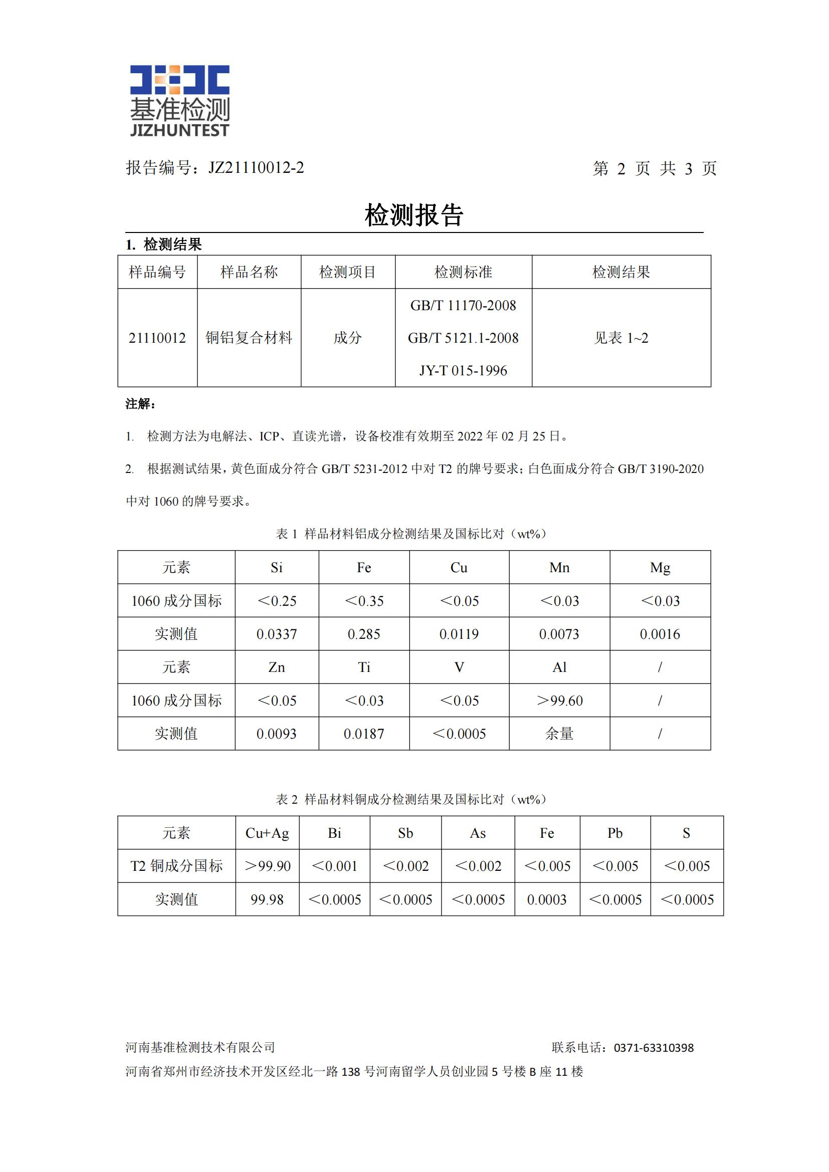 3、根據測試結果,白色面成分符合 GB/T 3190-2020 中對 1060 的牌號要求,黃色面成分樣品符合 GB/T 5231-2012 中對 T2 的牌號要求。